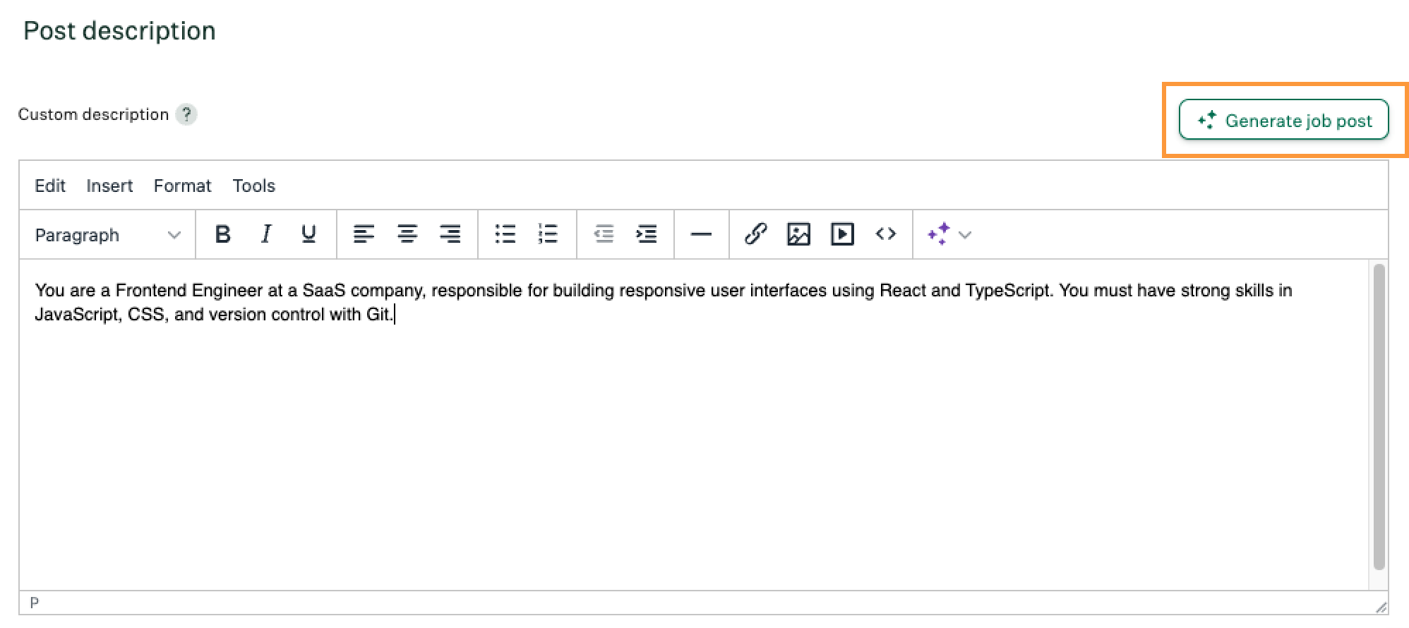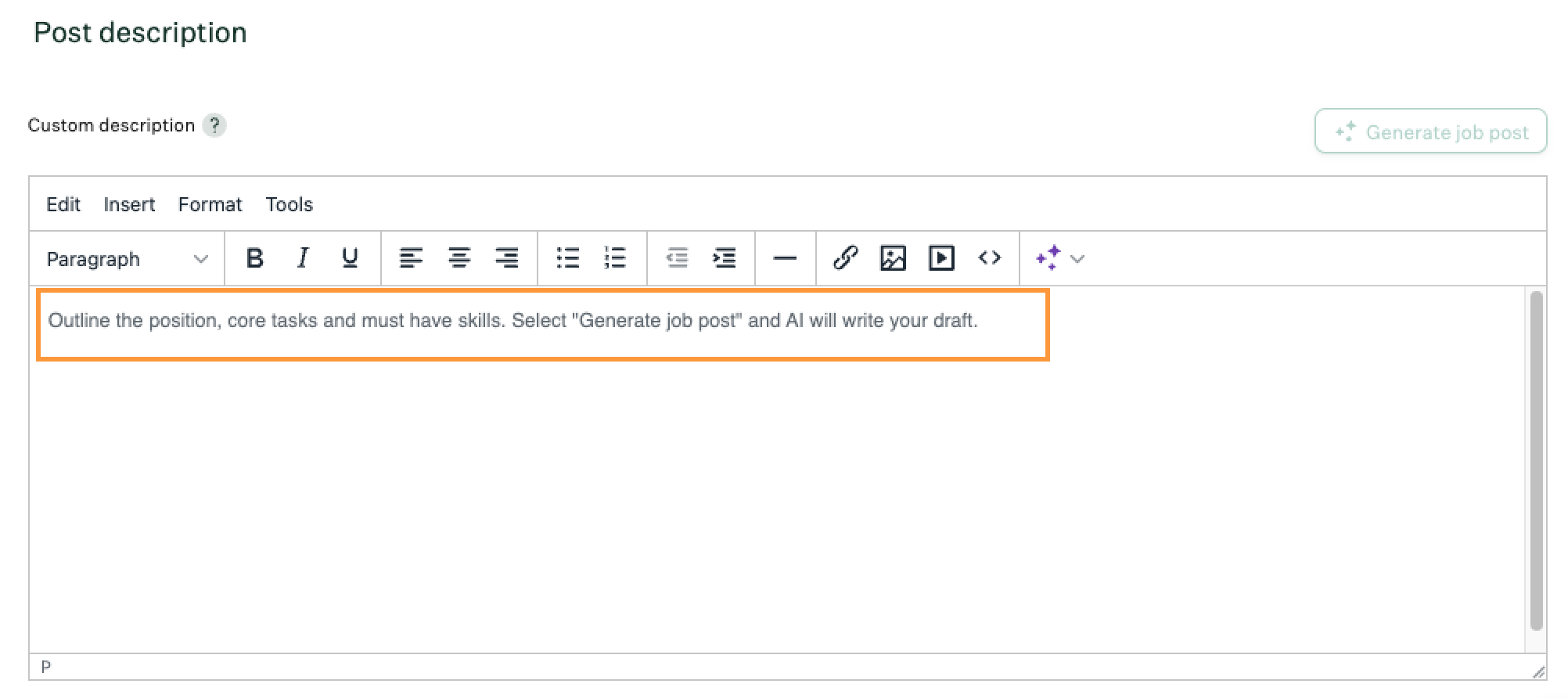 When you're creating a new job post, you can now easily create a job post description from a couple of key points. To get started, create a job post, then scroll to the post description editor.