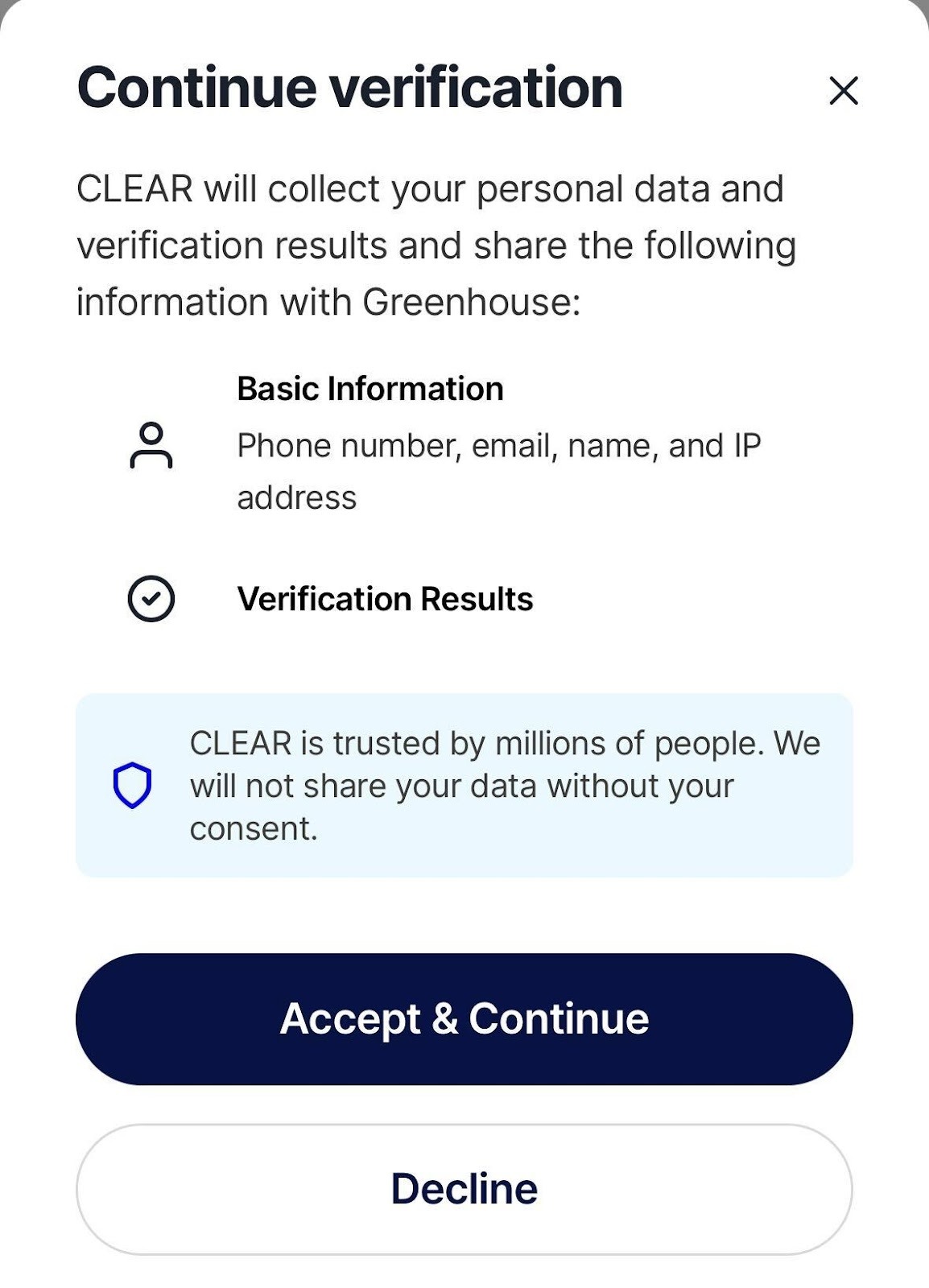 This FAQ provides technical and processing information about Greenhouse's features, identity verifications with CLEAR, to support your evaluation the feature.