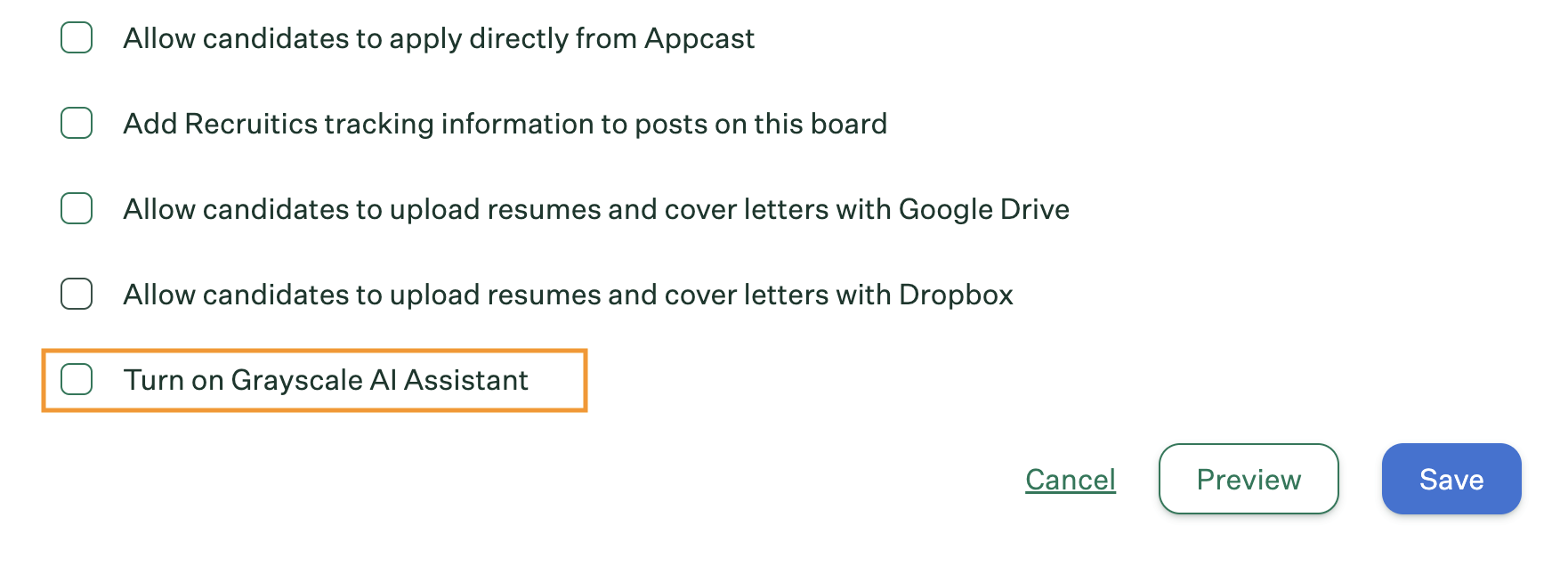 Go to Configure > Job boards & posts. Select the job board you want to update, then go to Board settings. Scroll to the "Partners" section, then check "turn on Grayscale AI Assistant."