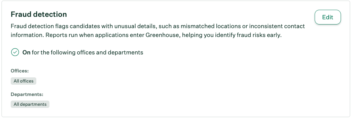 This guide explains how to turn on Fraud Detection by office or department, control access to fraud reports, and manage GDPR-related compliance settings. For rollout, coordinate with TA, Legal, and Security to align security controls with the candidate experience.