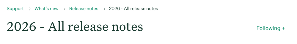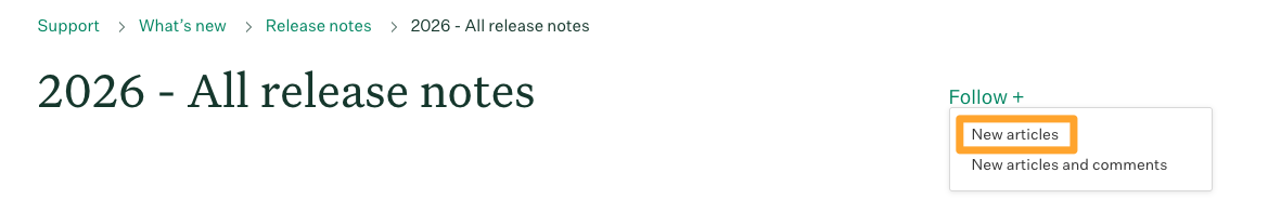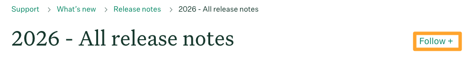 Navigate to the 2026 - All release notes page on the Support Site and click the Follow button in the top right corner.