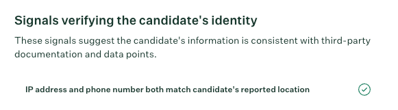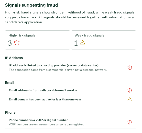 Weak fraud signals: Signals with low or contextual correlation to fraud that may require review, such as a mismatch between device time zone and reported location. These signals could be helpful in the fraud detection process when used in combination with other flags (e.g., multiple low-risk signals, suspicious LinkedIn, interview red flags, ID verification failures).