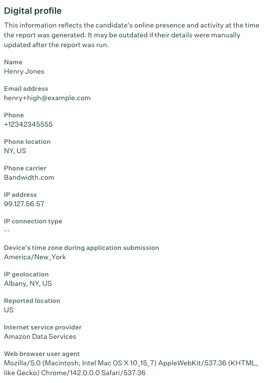 The full fraud report also includes a Digital profile using enrichment data provided by IPQS, a Greenhouse subprocessor, to provide additional context when reviewing the fraud signals.