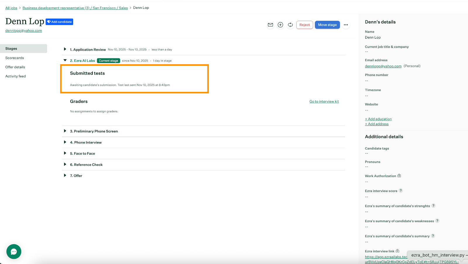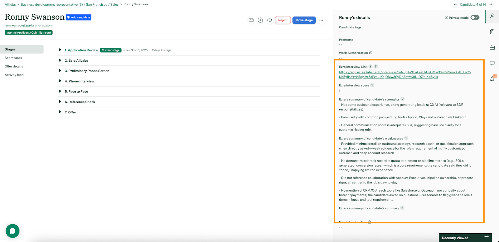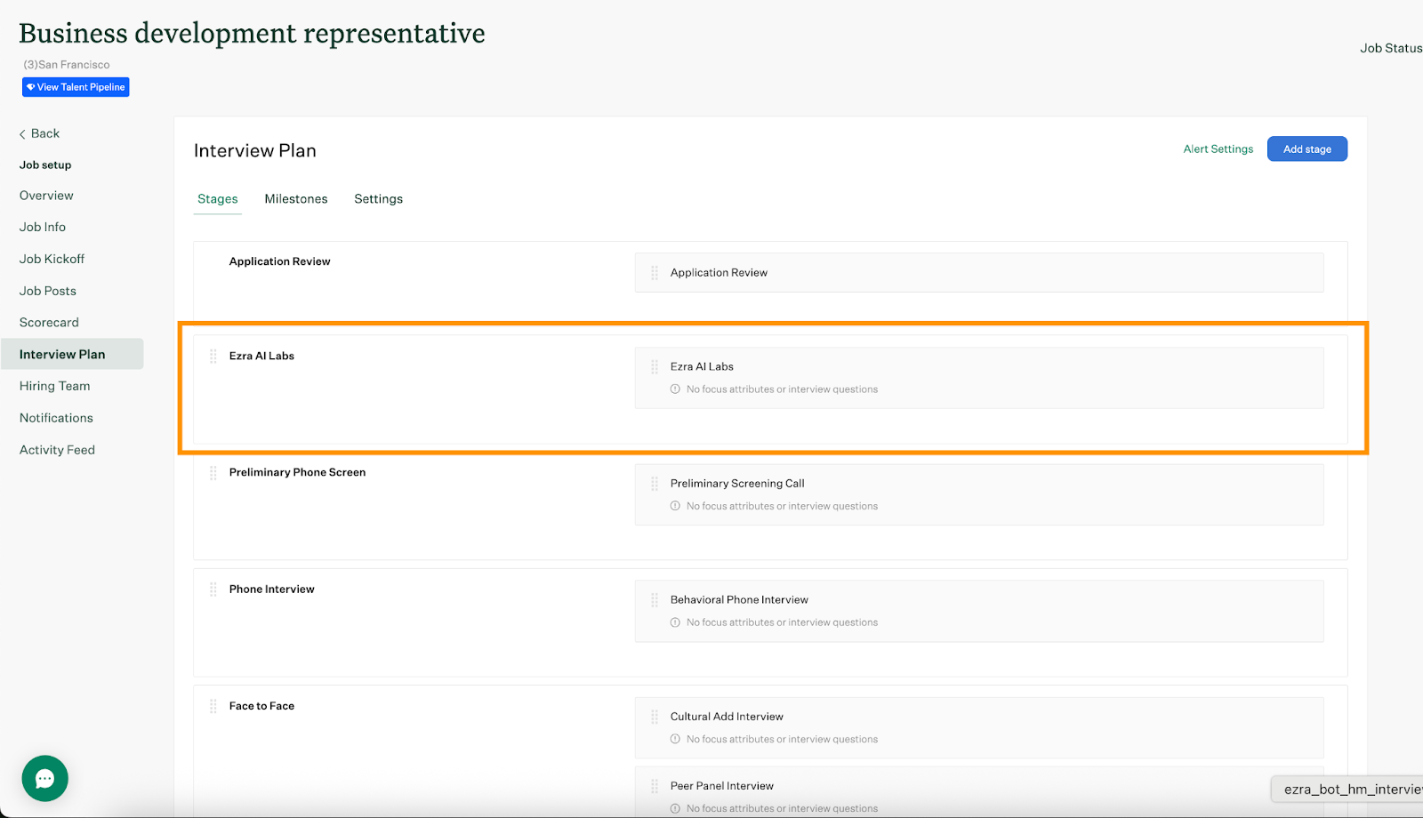 - Send Ezra interviews to candidates when they reach a stage of your choosing