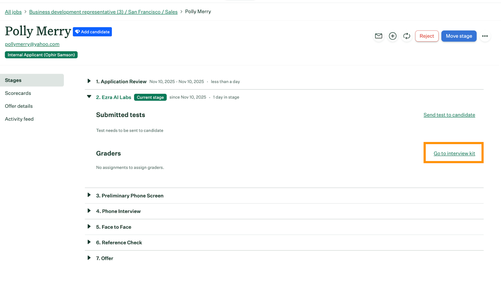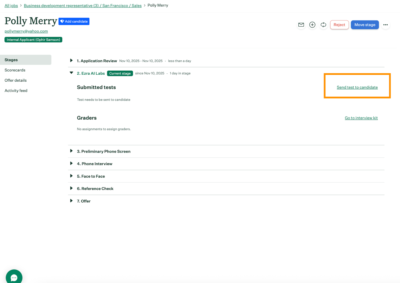 You can send an assessment to a candidate by selecting the Send Test button next to the interview stage. The assessment instructions will be sent by Ezra to the candidate, with a personalized link to where the candidate can take their Ezra interview.
