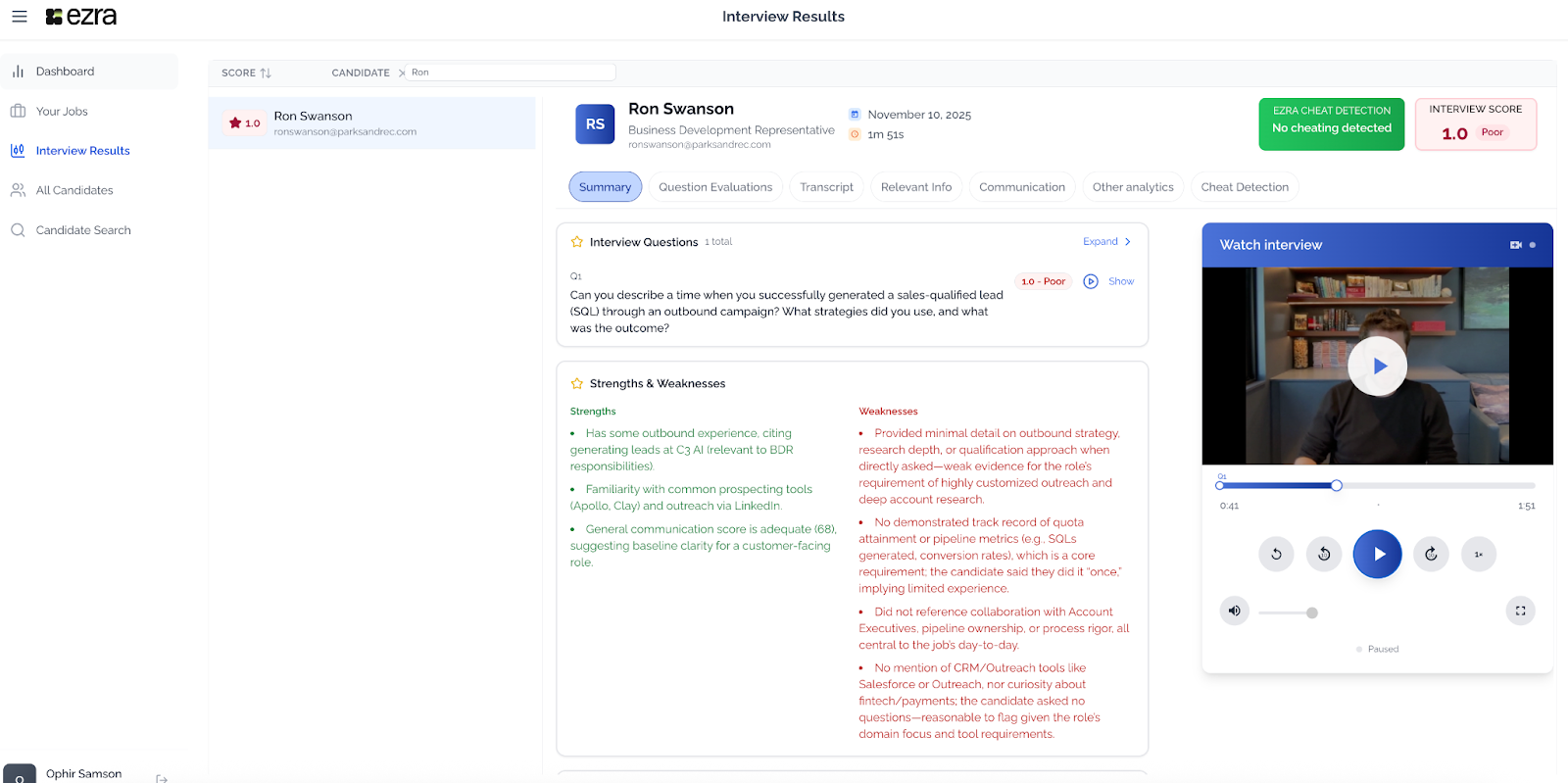 Ezra provides an AI-powered interviewing platform that conducts structured, voice-based candidate assessments on behalf of recruiters. Built on more than two years of proprietary voice-AI R&D, Ezra runs consistent 15-minute interviews that evaluate skills, communication, problem-solving, and potential fraud signals, then delivers scored, recruiter-ready summaries directly into Ezra’s Greenhouse account. The result is faster, higher-quality screening that helps companies identify real talent amid high applicant volume.