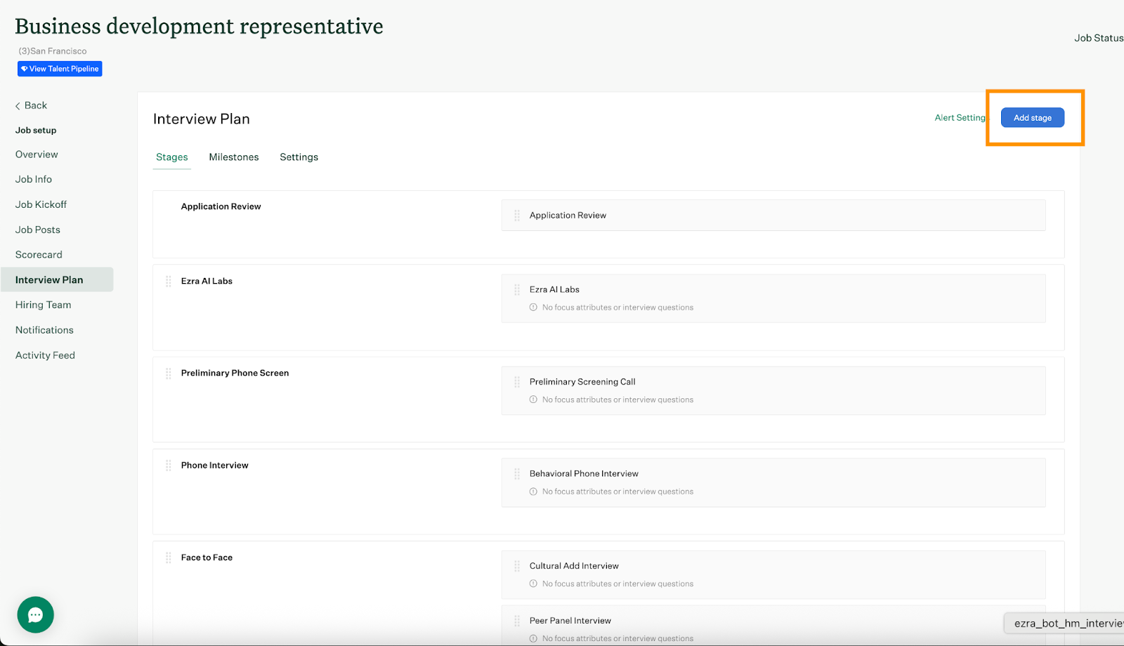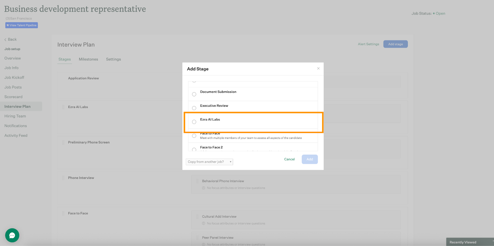 Once the Ezra integration is enabled for your organization, you will be able to add the Ezra assessment as an interview stage.