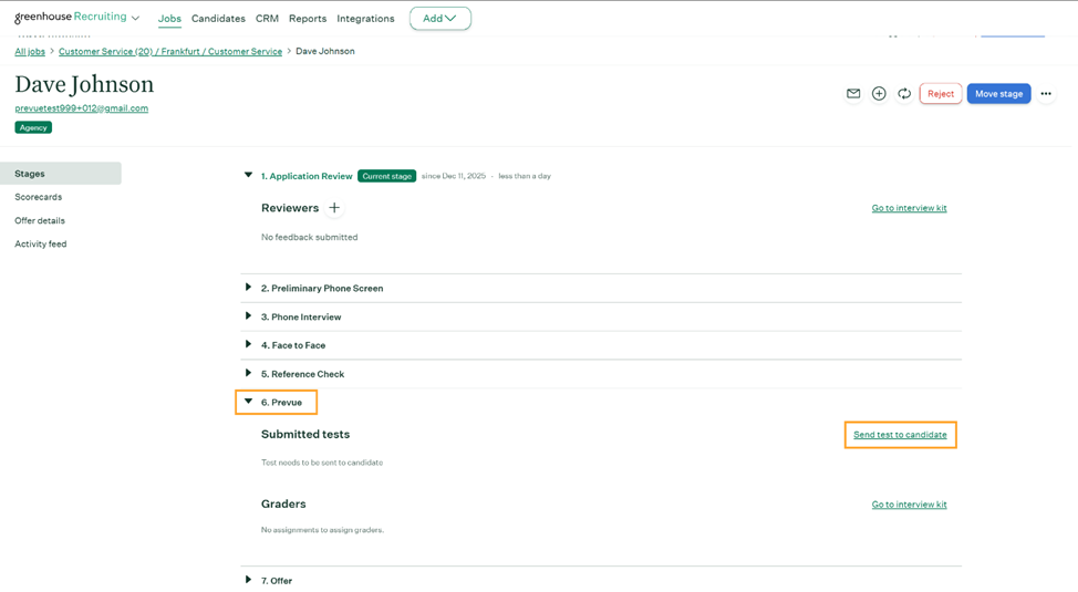 You can send an assessment to a candidate by selecting the Send Test button next to the interview stage. The assessment instructions will be sent by Prevue.