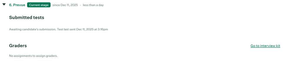 Once the candidate has submitted their test, the Interview Kit will contain a link to view the submitted test in the Prevue application. ‘Go to test’ will go directly to the reports in the Prevue application.