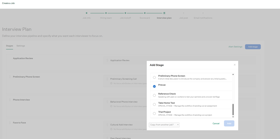 Once the Prevue integration is enabled for your organization, you will be able to add the Prevue assessment as an interview stage.