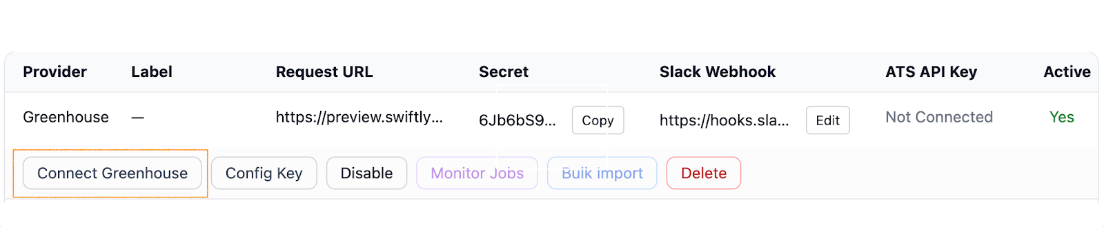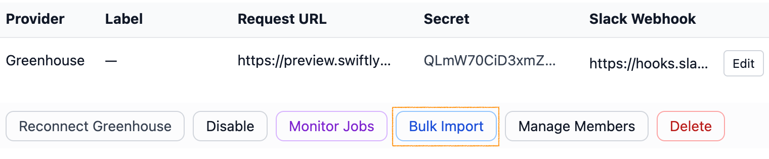 - In SwiftLynx, find your Greenhouse integration and click the Bulk Import button.