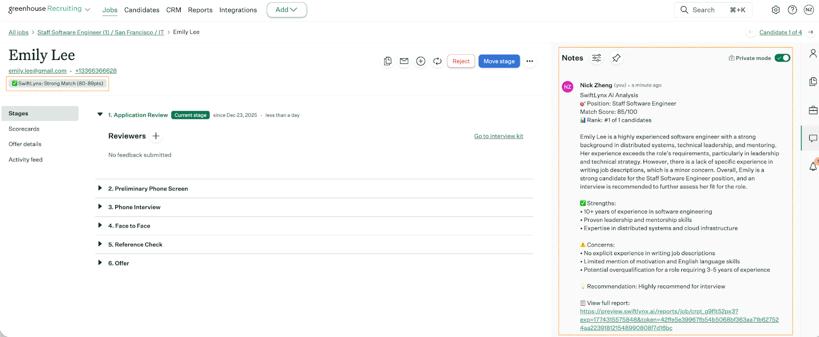 When a new application is submitted in Greenhouse, SwiftLynx automatically analyzes the candidate via the configured webhook.