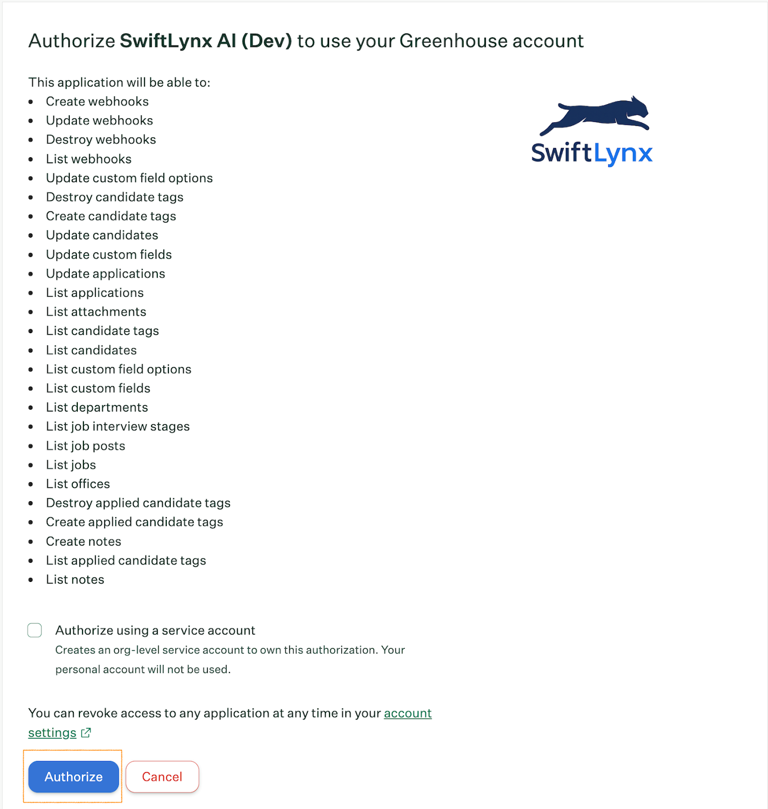 You can authorize the integration as your user or using a service account. Once authorized, you will be redirected back to SwiftLynx. The integration automatically configures a webhook in Greenhouse for the “Candidate has submitted application” event.