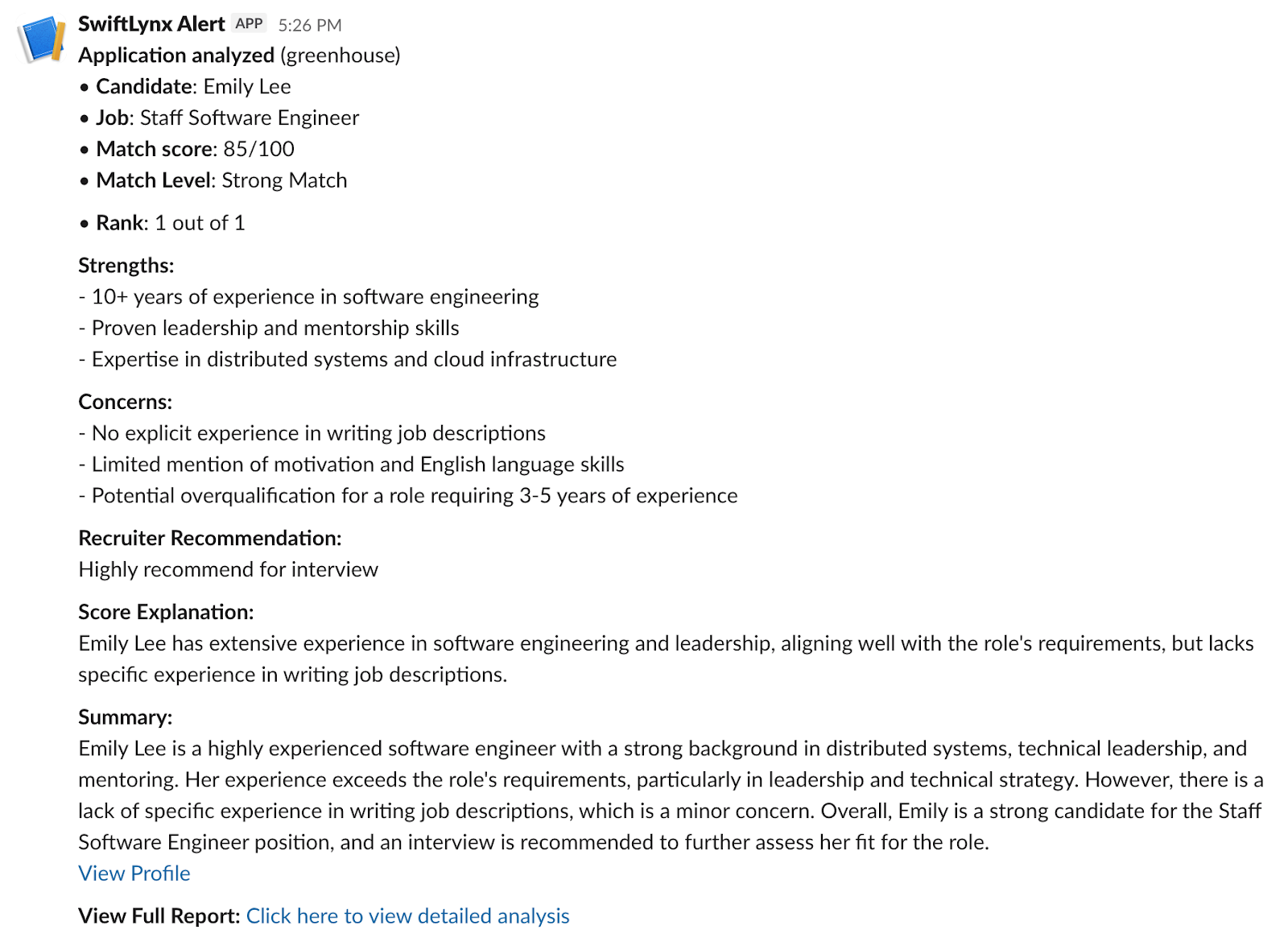 The SwiftLynx integration with Greenhouse Recruiting allows users to automatically sync candidate data, streamline application reviews, and leverage AI insights directly within your Greenhouse workflow. SwiftLynx automatically analyzes new applications from Greenhouse and posts a summary to Slack, adding a detailed analysis note and match score tag to the candidate's profile in Greenhouse.