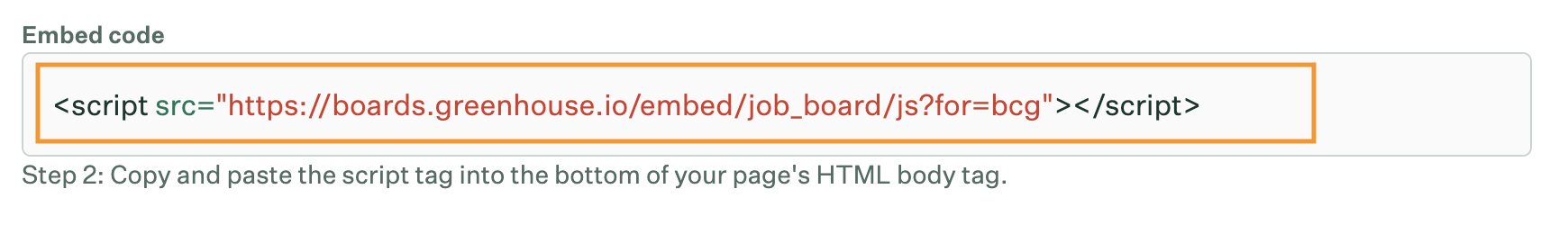 Next, replace YOURTOKEN with your Greenhouse job board token on your careers page. You'll find this near the bottom of your careers page, just before the closing </body> tag.