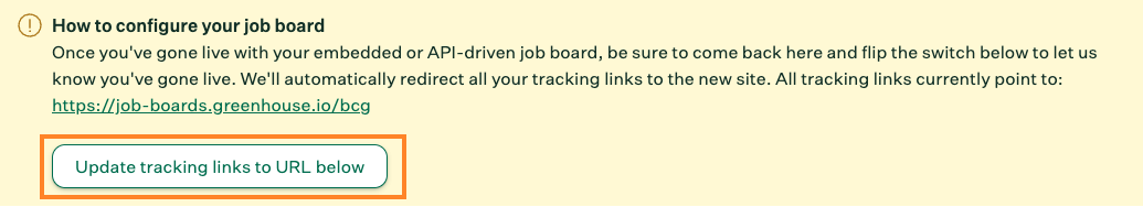 Once your embedded job board is live, update Greenhouse so your tracking links (and other job board URLs) send candidates to your careers page instead of boards.greenhouse.io.