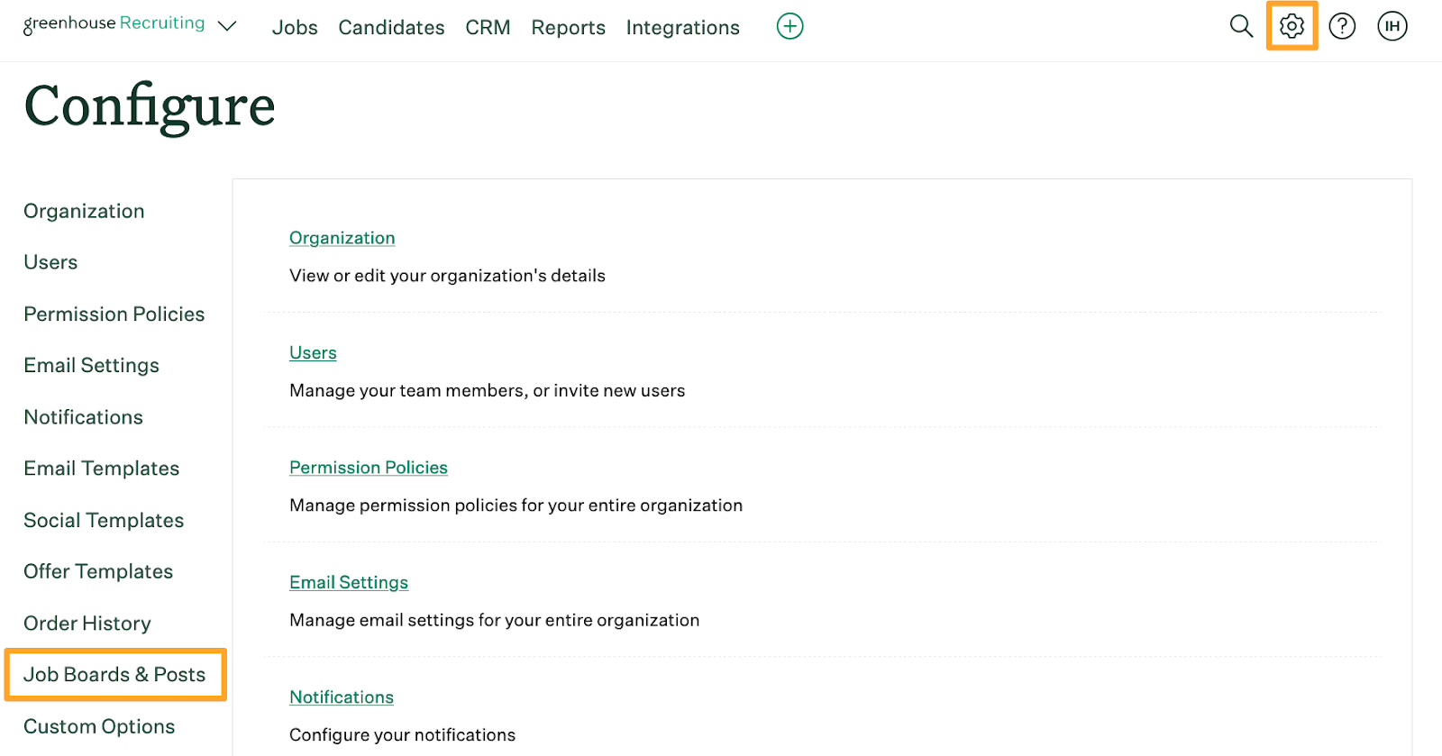 To enable the SEEK Ad Sync integration, first contact your SEEK account manager to active it for your account. Once that’s completed, navigate to Greenhouse and click the Configure icon on your navigation bar, then click Job Boards & Posts on the left.