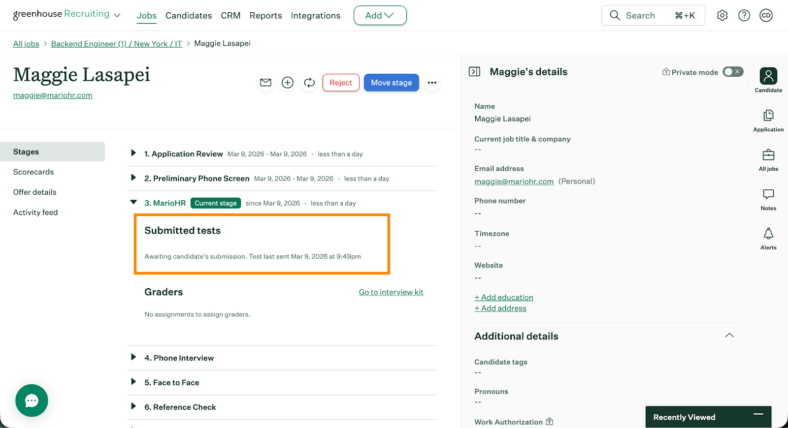 After it has been sent, an assessment’s status will display in Greenhouse Recruiting.