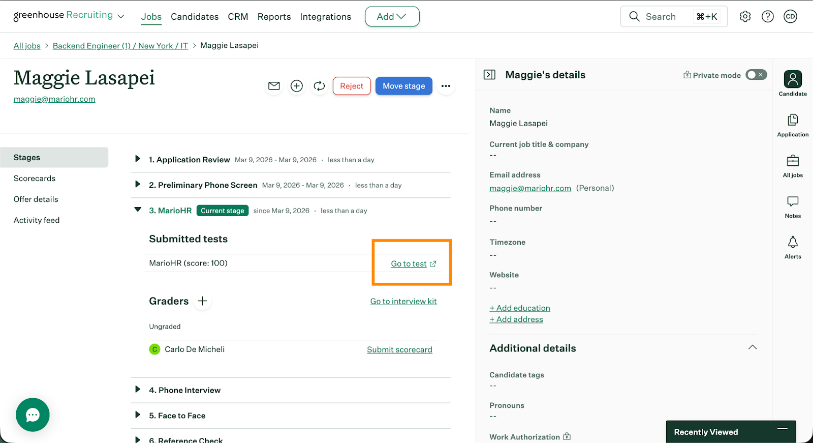 Once the candidate has submitted their test, the Interview Kit will contain a link to view the submitted test in the MarioHR application.