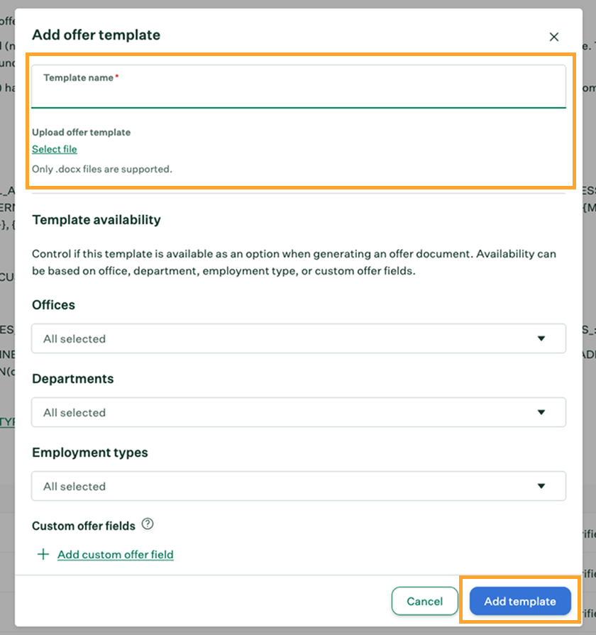 Name your offer template and select a file to upload. If needed, you can also limit the offer templates to specific offices, departments, employment types, or custom offer fields by completing the other fields.