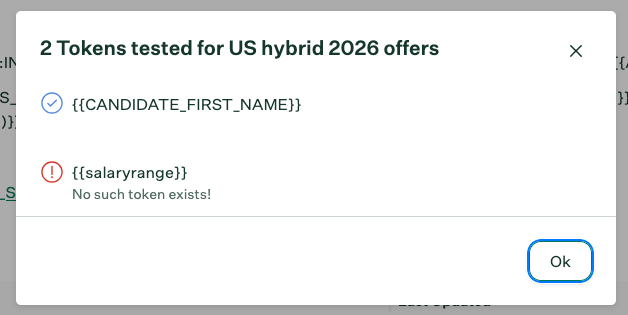 Greenhouse Recruiting will review the offer template to ensure all tokens included are available in your organization's account. See the section below for more troubleshooting information.