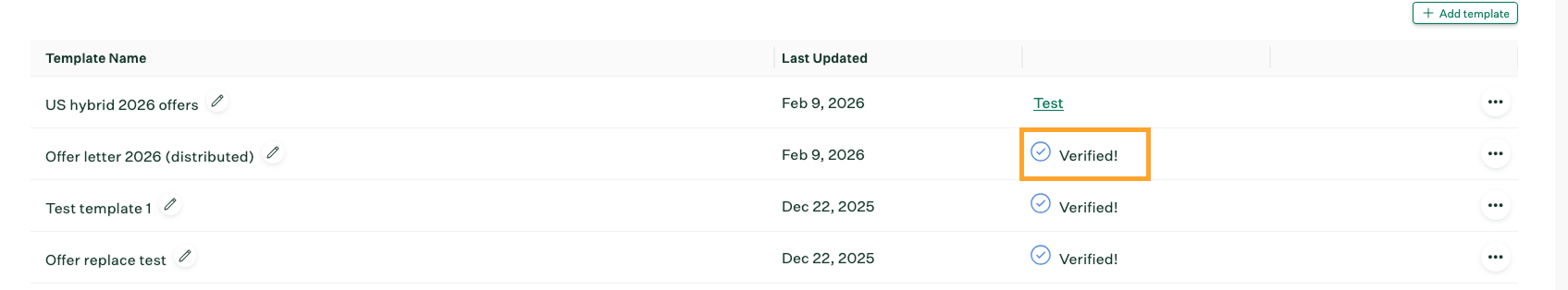 After your tokens are tested, the offer template will be updated to Verified and can be used to send offer documents to candidates.